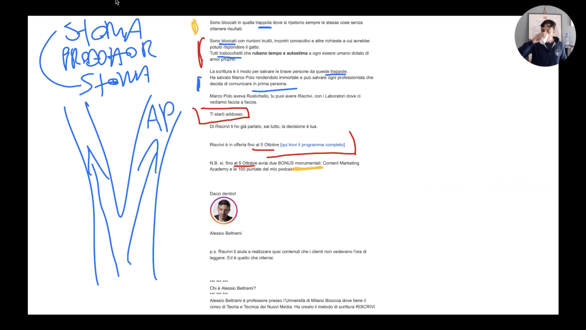Alessio Beltrami è professore presso l’Università di Milano Bicocca dove tiene il corso di Teoria e Tecnica dei Nuovi Media. Ha creato il metodo di scrittura RISCRIVI e formato oltre 500 imprenditori con i percorsi avanzati di Content Marketing Academy.
